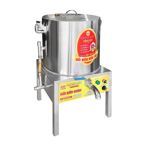 Nồi nấu cháo sử dụng điện mẫu mới nhất 2025 được thiết kế và sản xuất bởi Cty Inox Nhân Nghĩa, nồi sử dụng dầu gia nhiệt để dẫn nhiệt cấp nhiệt giúp cho cháo nhanh nhừ và không bị khê cháo, được thiết kế bằng inox SUS 304 cao cấp 3 lớp không rỉ sét giúp nồi giữ nhiệt lâu hơn và rút ngắn thời gian nấu so với các loại nồi nấu cháo thông thường khác trên thị trường.