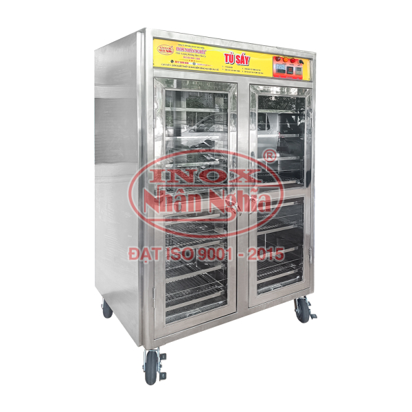 Bạn đã từng thắc mắc tại sao lại phải trang bị tủ sấy chén đĩa trong khu bếp nhà hàng, khách sạn,.. của mình chưa? Lý do là vì lượng chén bát và ly tách,… cần phục vụ mỗi ngày quá lớn, phương pháp tiệt trùng bằng cách phơi nắng không thể đáp ứng được. Chính vì thế, chén bát sau khi rửa sạch sẽ được cho vào từng khay của tủ sấy chén, bật công tắc và chọn nhiệt độ thích hợp. Tất cả chén bát, vật dụng của bạn sẽ được tiệt trùng và sấy khô hiệu quả. 2. Ưu điểm tủ sấy chén đĩa 2 cánh sử dụng điện Tủ sấy chén đĩa 2 cánh sử dụng điện có ưu điểm chung đó là năng suất cao, cơ chế hoạt động hoàn toàn tự động. Nhiệt độ, thời gian và chế độ sấy có thể điều chỉnh linh hoạt. Với thiết kế và cấu tạo hoàn toàn bằng inox cao cấp, có độ bền cao và luôn bền đẹp theo thời gian. Do sử dụng inox 304 cao cấp nên bề ngoài tủ luôn tạo được vẻ ngoài đẹp mắt, sáng bóng, chuyên nghiệp và đảm bảo an toàn vệ sinh thực phẩm. Việc sử dụng tủ sấy chén bát 2 cánh sử dụng điện giúp cho các khu bếp ăn công nghiệp, những nói chế biến thực phẩm số lượng lớn tiết kiệm được thời gian cũng như nhân công lau khô bát đĩa. Khi sử dụng tủ sấy chén bát thì bạn có thể cắt giảm được hàng chục nhân công mà chén bát cũng được sạch sẽ, diệt khuẩn, đảm bảo an toàn vệ sinh thực phẩm hơn hẳn. 2. Thông tin chi tiết Tủ được thiết kế và sản xuất bằng inox SUS 304 ngoại nhập. Tủ được bít kín 3 mặt hông, 2 mặt trên dưới và thiết kế cửa liền tránh côn trùng xâm nhập vào bên trong. Nhằm đảm bảo an toàn vệ sinh thực phẩm. Khung cửa bằng inox, thiết kế cửa kính cường lực để có thể nhìn được sản phẩm bên trong đang sấy. Đồng hồ timer, đèn tia cực tím tiệt trùng Đèn báo nhiệt và bộ phận điện tự động. Moteur trộn gió chuyên dụng, điện trở, đồng hồ nhiệt. Tủ có 4-6 chân inox chịu nhiệt có tăng đưa điều chỉnh Hệ thống điều khiển tự động, sử dụng linh kiện điện tử mới nhất hiện nay. Trường hợp khay chứa nước xuống dưới mức cho phép, bộ phận điện sẽ không hoạt động và báo thiếu nước, tránh trường hợp bị khô cây điện trở sẽ không bị cháy và chống giật điện. Tủ hấp điều khiển nhiệt độ theo nhu cầu sử người sử dụng. Chú ý: Khi nhiệt độ đúng theo nhu cầu ( đèn đỏ bật sáng) tủ sấy Nhân Nghĩa sẽ tự động ngắt dòng điện nhằm tiết kiệm điện, khi nhiệt độ xuống không đúng theo yêu cầu, tủ hấp sẽ hoạt động bình thường và ngược lại.