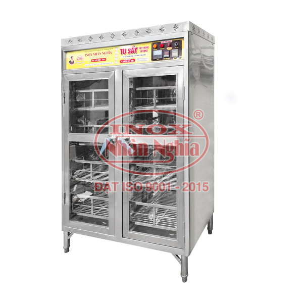 Bạn đã từng thắc mắc tại sao lại phải trang bị tủ sấy chén đĩa trong khu bếp nhà hàng, khách sạn,.. của mình chưa? Lý do là vì lượng chén bát và ly tách,… cần phục vụ mỗi ngày quá lớn, phương pháp tiệt trùng bằng cách phơi nắng không thể đáp ứng được. Chính vì thế, chén bát sau khi rửa sạch sẽ được cho vào từng khay của tủ sấy chén, bật công tắc và chọn nhiệt độ thích hợp. Tất cả chén bát, vật dụng của bạn sẽ được tiệt trùng và sấy khô hiệu quả. 2. Ưu điểm tủ sấy chén đĩa 2 cánh sử dụng điện Tủ sấy chén đĩa 2 cánh sử dụng điện có ưu điểm chung đó là năng suất cao, cơ chế hoạt động hoàn toàn tự động. Nhiệt độ, thời gian và chế độ sấy có thể điều chỉnh linh hoạt. Với thiết kế và cấu tạo hoàn toàn bằng inox cao cấp, có độ bền cao và luôn bền đẹp theo thời gian. Do sử dụng inox 304 cao cấp nên bề ngoài tủ luôn tạo được vẻ ngoài đẹp mắt, sáng bóng, chuyên nghiệp và đảm bảo an toàn vệ sinh thực phẩm. Việc sử dụng tủ sấy chén bát 2 cánh sử dụng điện giúp cho các khu bếp ăn công nghiệp, những nói chế biến thực phẩm số lượng lớn tiết kiệm được thời gian cũng như nhân công lau khô bát đĩa. Khi sử dụng tủ sấy chén bát thì bạn có thể cắt giảm được hàng chục nhân công mà chén bát cũng được sạch sẽ, diệt khuẩn, đảm bảo an toàn vệ sinh thực phẩm hơn hẳn. 2. Thông tin chi tiết Tủ được thiết kế và sản xuất bằng inox SUS 304 ngoại nhập. Tủ được bít kín 3 mặt hông, 2 mặt trên dưới và thiết kế cửa liền tránh côn trùng xâm nhập vào bên trong. Nhằm đảm bảo an toàn vệ sinh thực phẩm. Khung cửa bằng inox, thiết kế cửa kính cường lực để có thể nhìn được sản phẩm bên trong đang sấy. Đồng hồ timer, đèn tia cực tím tiệt trùng Đèn báo nhiệt và bộ phận điện tự động. Moteur trộn gió chuyên dụng, điện trở, đồng hồ nhiệt. Tủ có 4-6 chân inox chịu nhiệt có tăng đưa điều chỉnh Hệ thống điều khiển tự động, sử dụng linh kiện điện tử mới nhất hiện nay. Trường hợp khay chứa nước xuống dưới mức cho phép, bộ phận điện sẽ không hoạt động và báo thiếu nước, tránh trường hợp bị khô cây điện trở sẽ không bị cháy và chống giật điện. Tủ hấp điều khiển nhiệt độ theo nhu cầu sử người sử dụng. Chú ý: Khi nhiệt độ đúng theo nhu cầu ( đèn đỏ bật sáng) tủ sấy Nhân Nghĩa sẽ tự động ngắt dòng điện nhằm tiết kiệm điện, khi nhiệt độ xuống không đúng theo yêu cầu, tủ hấp sẽ hoạt động bình thường và ngược lại.